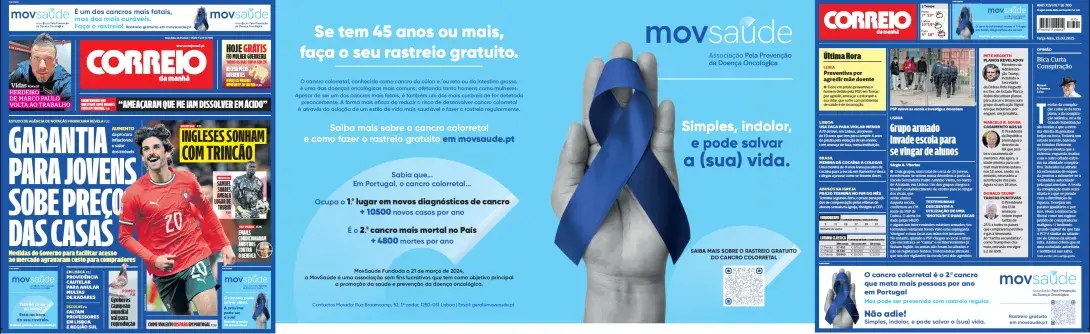 No âmbito do Mês da Sensibilização para o Cancro Colorretal, a MovSaúde tomou uma ação simbólica e impactante ao pintar de azul a capa do Correio da Manhã, com o objetivo de alertar a população para a importância da prevenção e da deteção precoce desta doença.